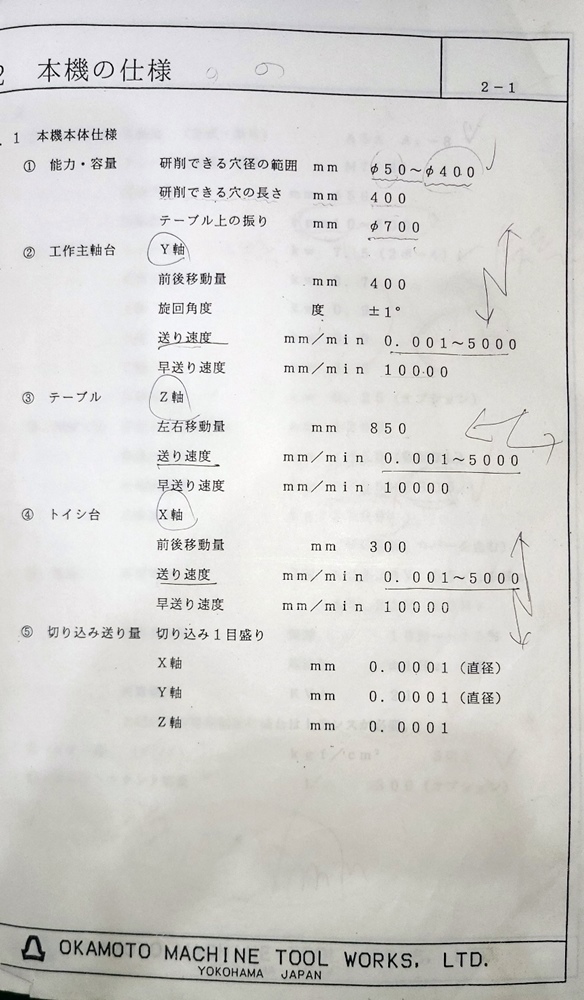 Work Capacity : hole diameter 50~400mm , length 400mm, table swing 700mm